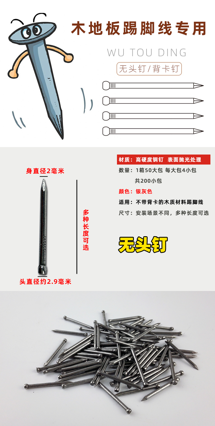 Headless nails Skirting board Special nails Paste skirting line nails Wooden floor foot line nails Solid wood skirting board headless steel nails