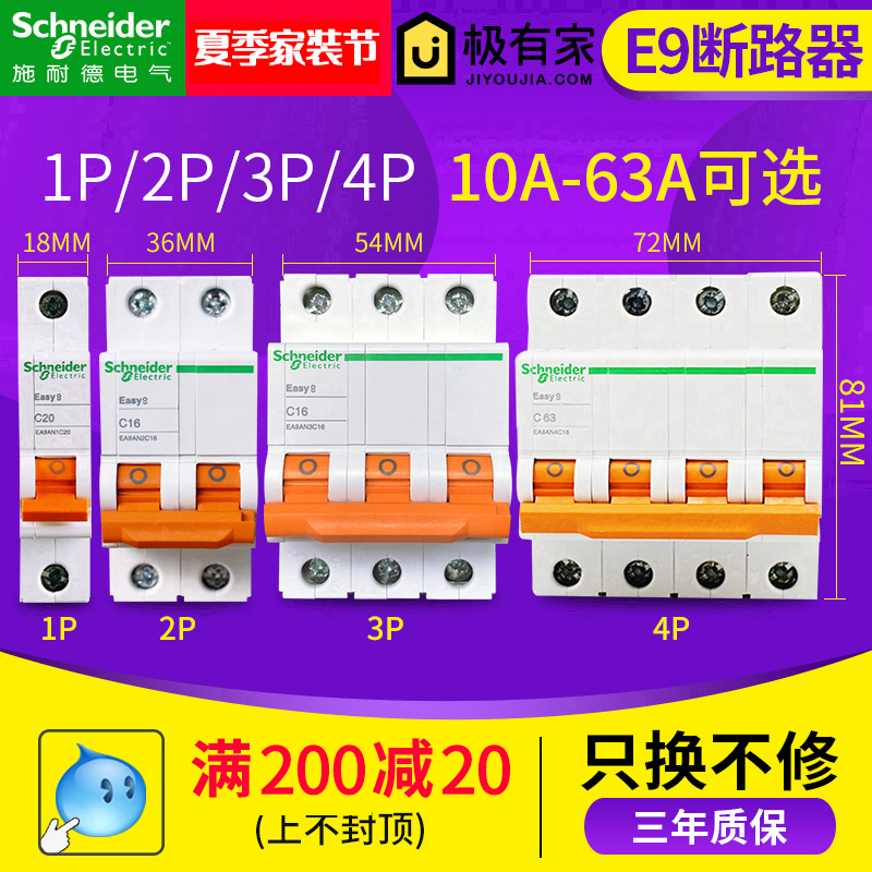 Schneider air switch Household circuit breaker E9 small air open 1P20A 16A-63A125A 2P3P4P