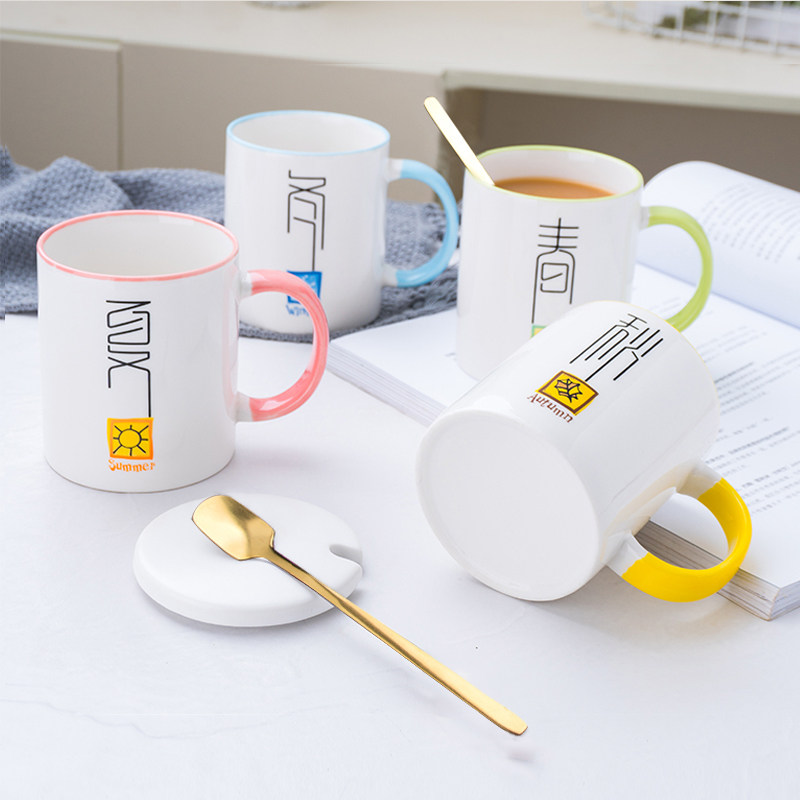 Creative cartoon cup spring, summer, autumn and winter ceramic cup personality cute Milk Cup with lid with spoon