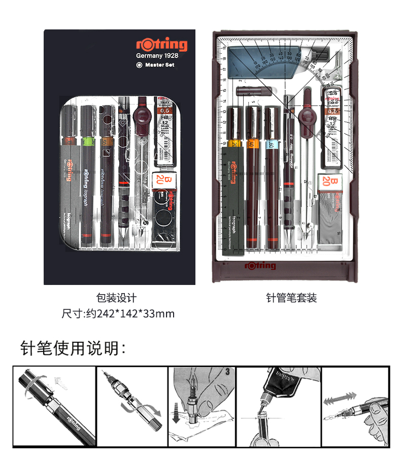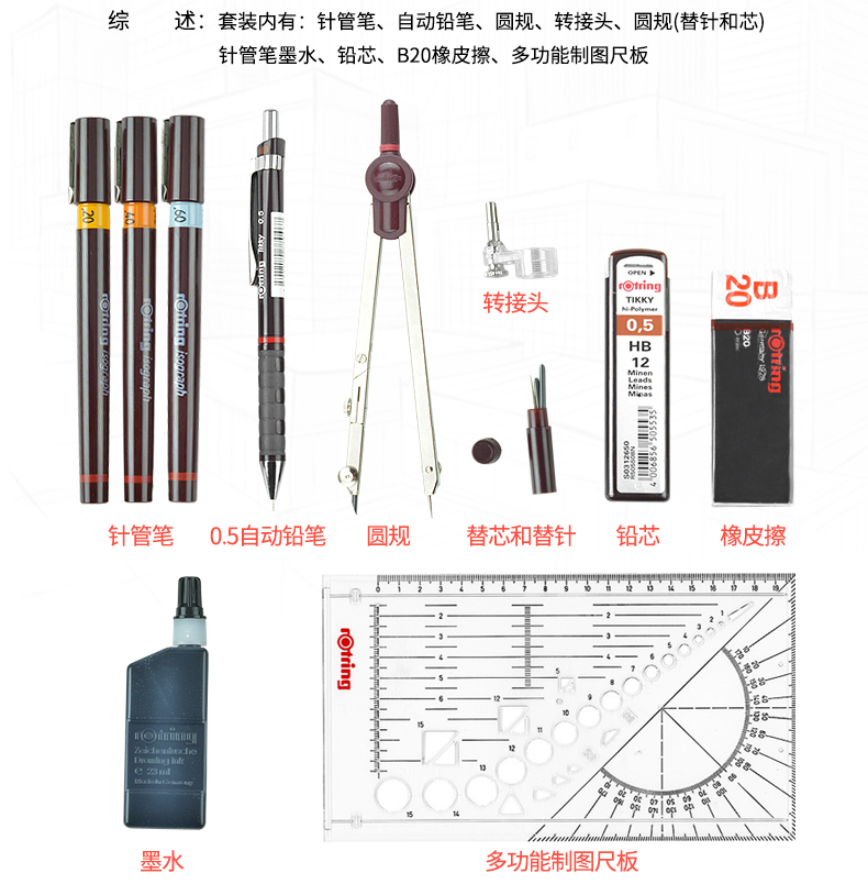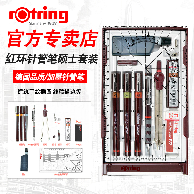 (Red Ring Official Store) German import rotring Japan Red Ring Needle Tube Pen can be added ink hand-drawn design students with 0.1mm engineer professional drawing needle pen master set