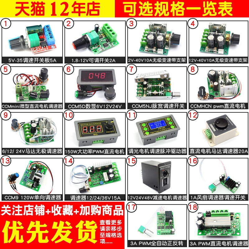 PWM DC motor governor 5V-35 speed control switch board 5A (1) PWM DC motor governor 1 8-12V adjustable switch 2A (1) 10A