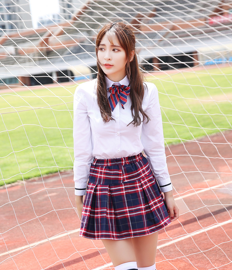 Women's short-sleeved shirt Dark red plaid skirt Bow tie Women's long-sleeved shirt Plaid Skirt Bow Tie Men's short-sleeved shirt Black shorts Tie Men's long-sleeved shirt Black trousers Tie Women's short-sleeved shirt Red plaid skirt