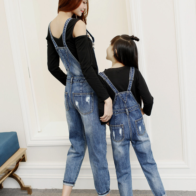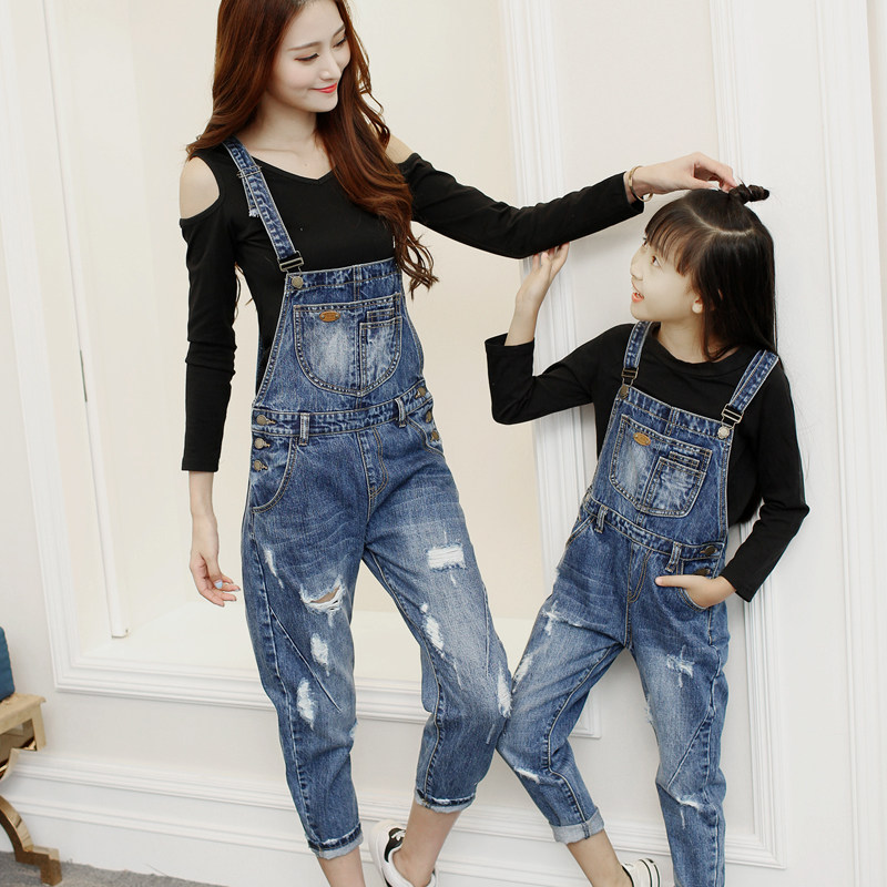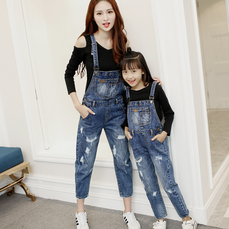 Fashionable parent-child outfit denim bib pants nine cent women's summer dress ripped one-piece girls big children's pants one-piece