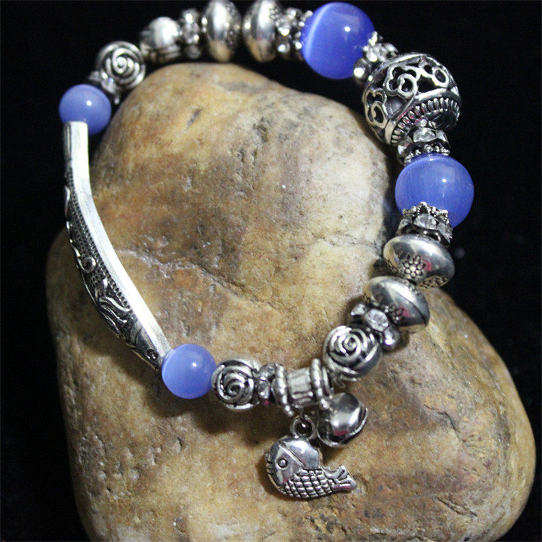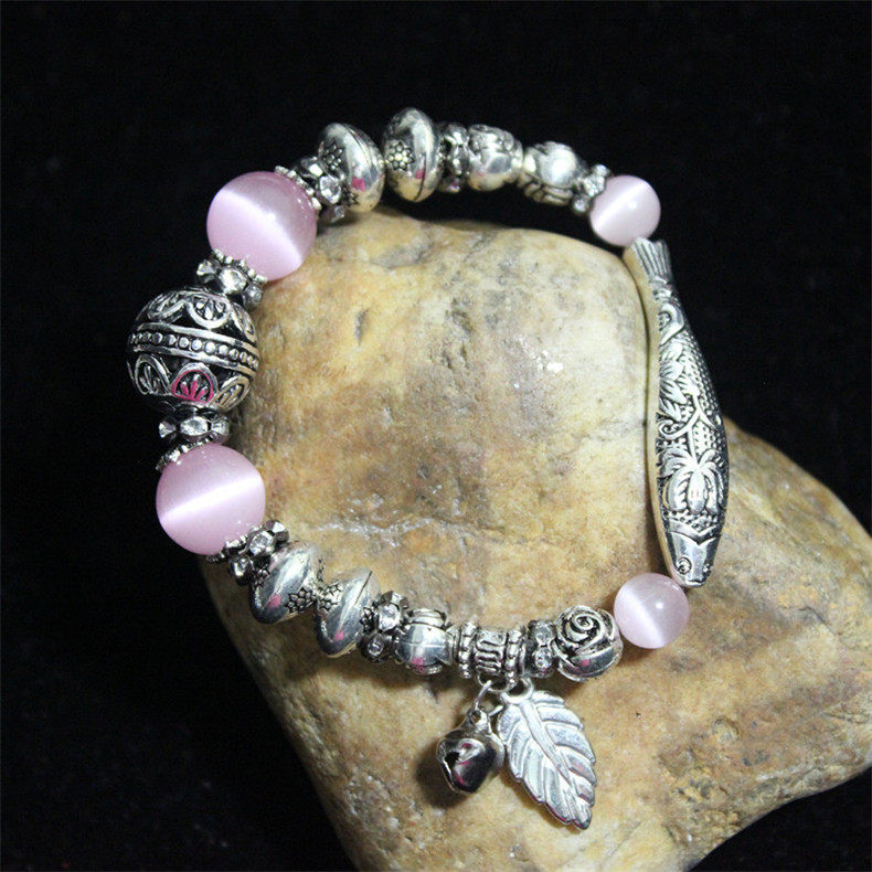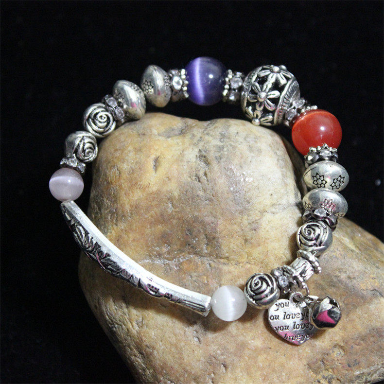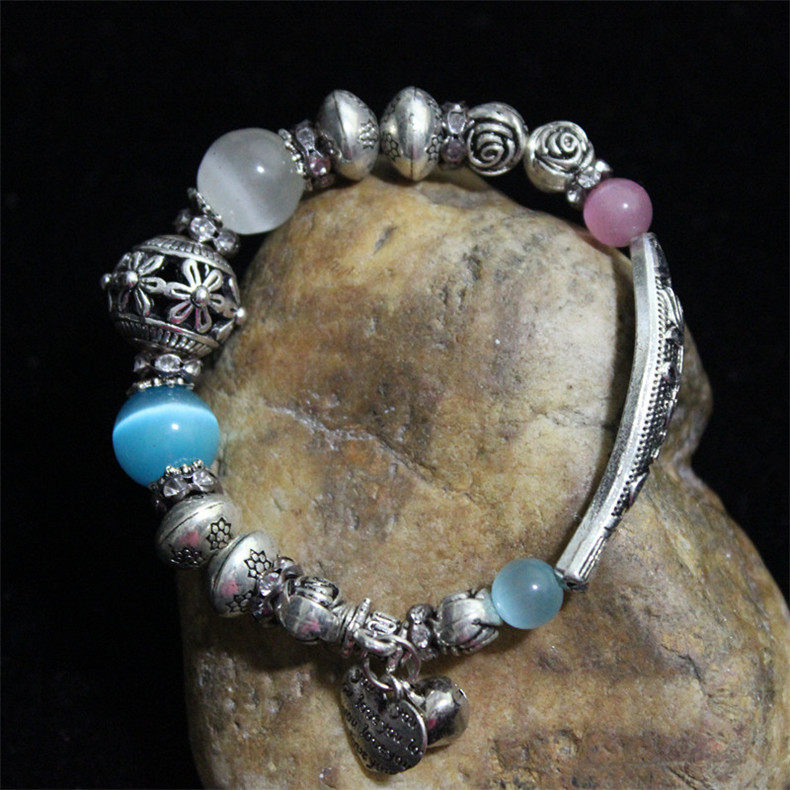 Tibetan silver Miao silver jewelry Retro ethnic style original bracelet Female diy handmade ethnic colored stone bracelet
