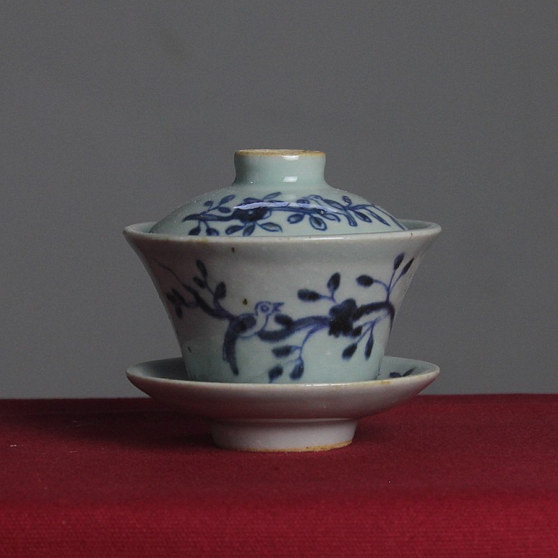 Jingdezhen imitated ancient green flower porcelain tea set People's kiln iron rust spot 3 only cover bowl Qinghua tea tea bowl tea ceremony