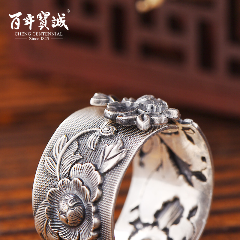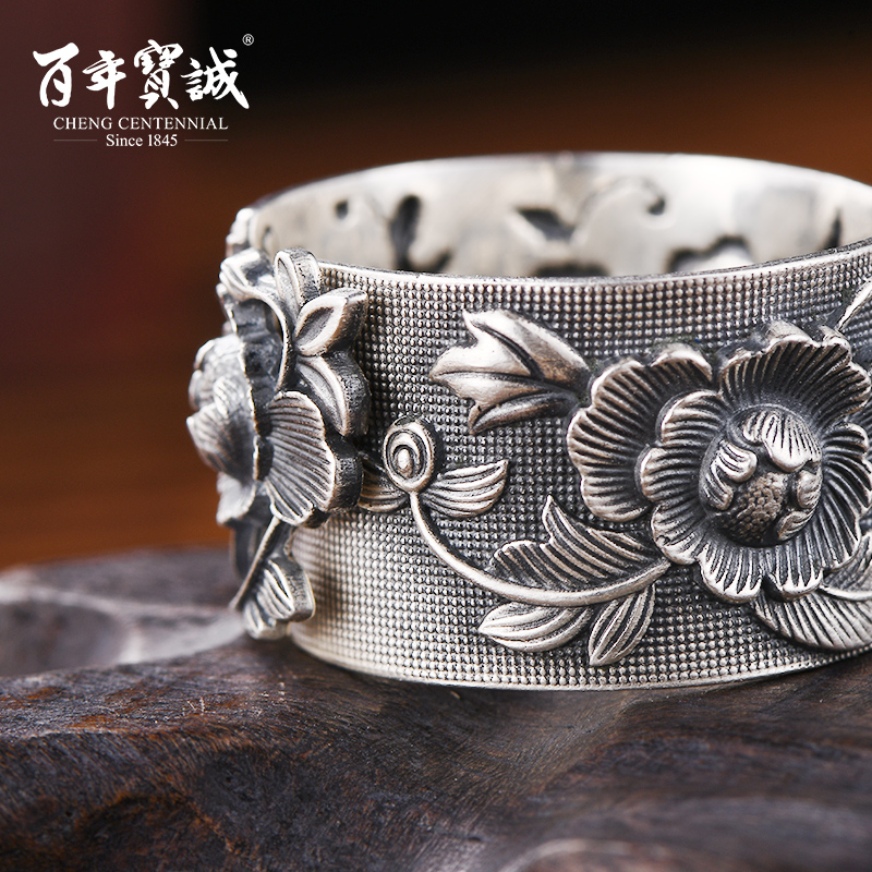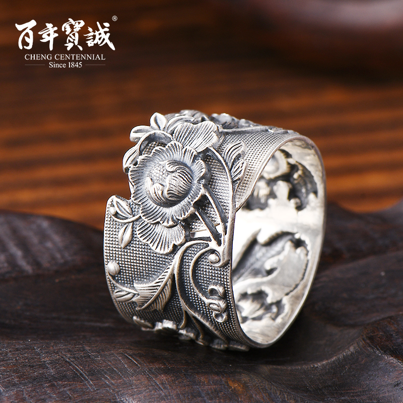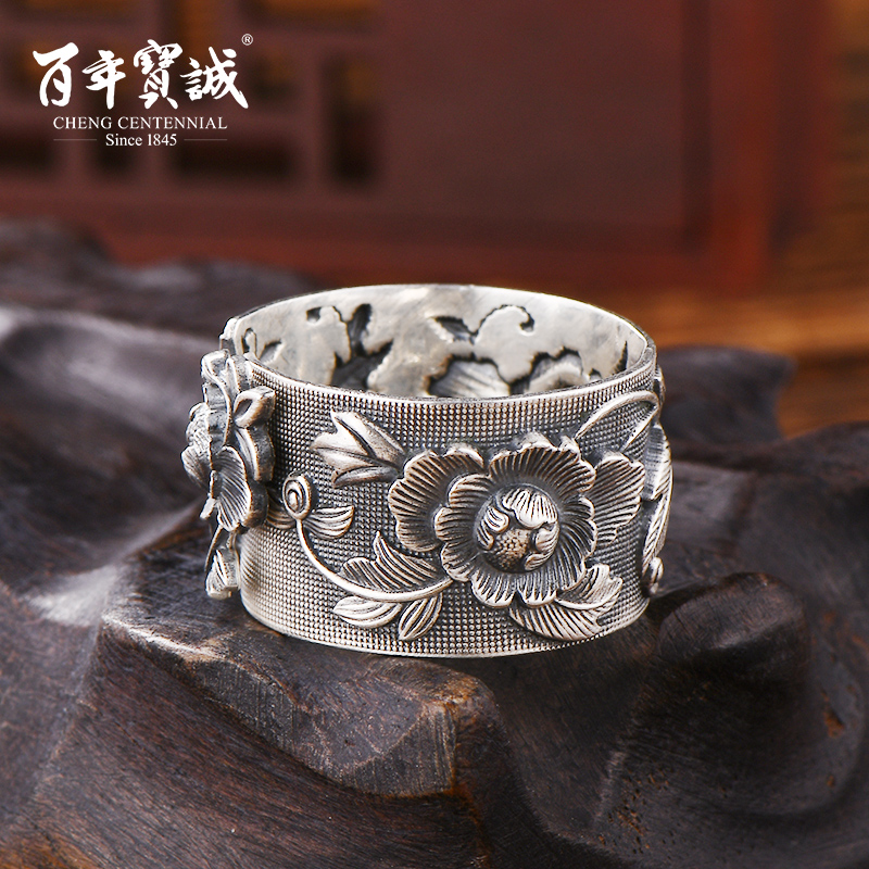 Centuries-old Baocheng 999 pure silver ring male and female retro to make old national wind wide face adjustable Dudan foot silver wrench