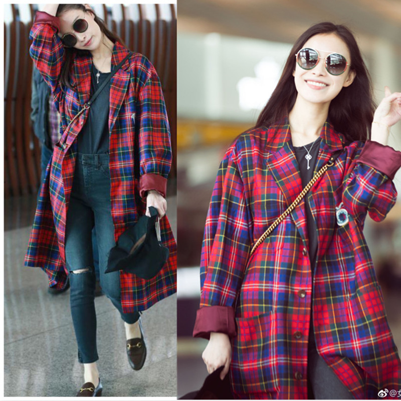 Ni Ni star with the same plaid trench coat women 2021 spring and autumn new Korean version of the long version of the British style loose coat tide