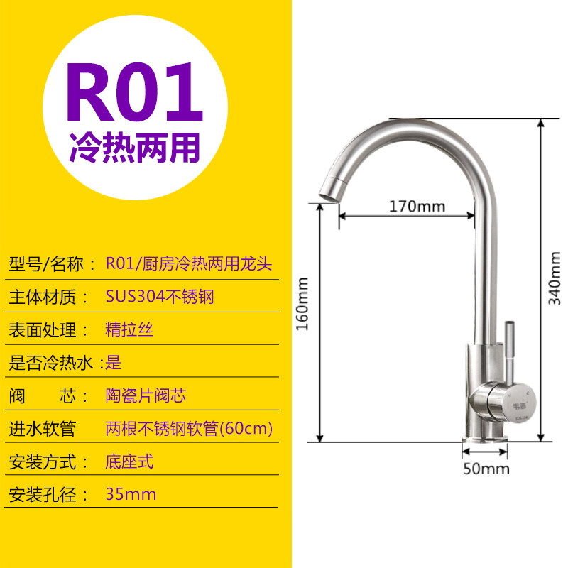 304 stainless steel tap hot and cold water kitchen tap washing basin with single-hole swivel tap