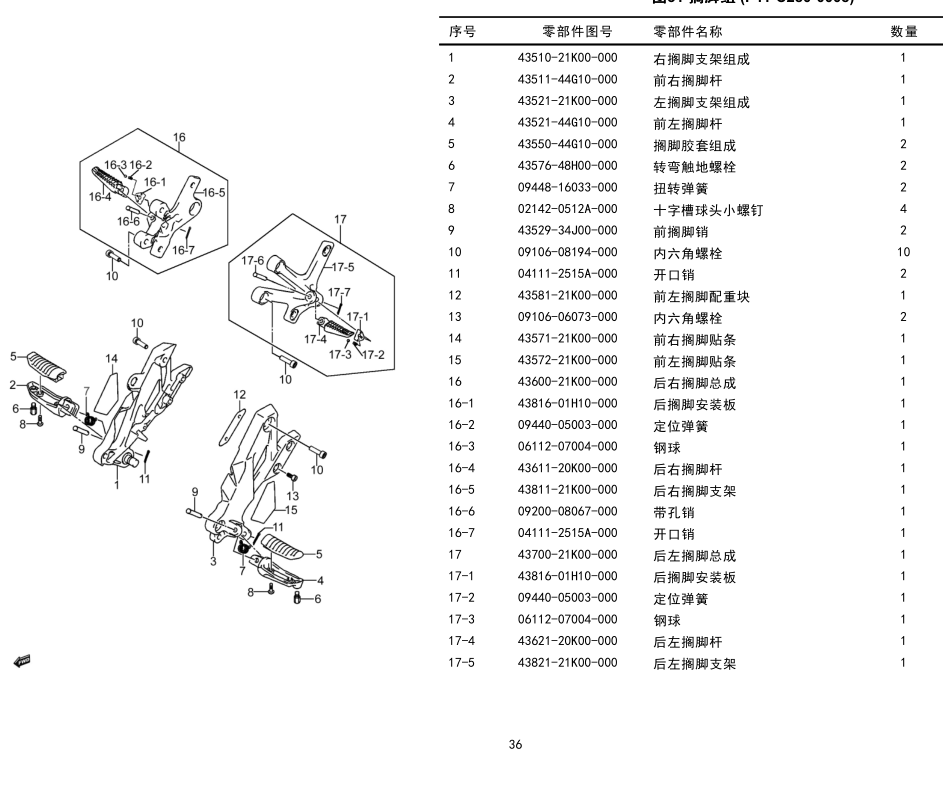 Front left footrest bracket make up 43521-21K00 front right footrest bracket make up 43510-21K00 turn gear pedal lever shaft front left footed lever 43521-44G10