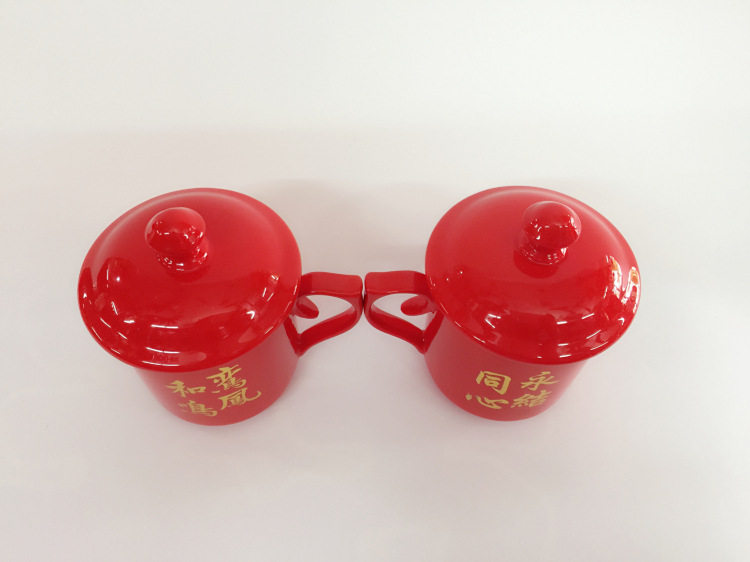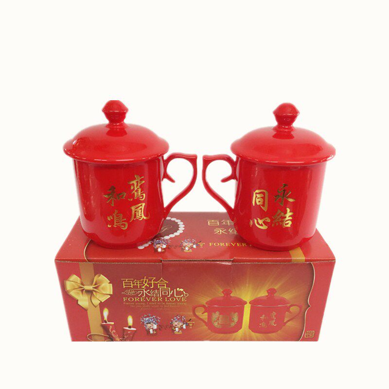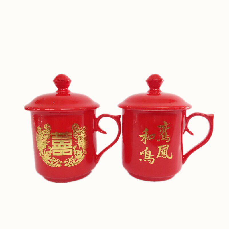 Chinese red dragon and phoenix pair cup set wedding handover cup wine gift toast tea cup wedding ceramic with lid handle happy cup
