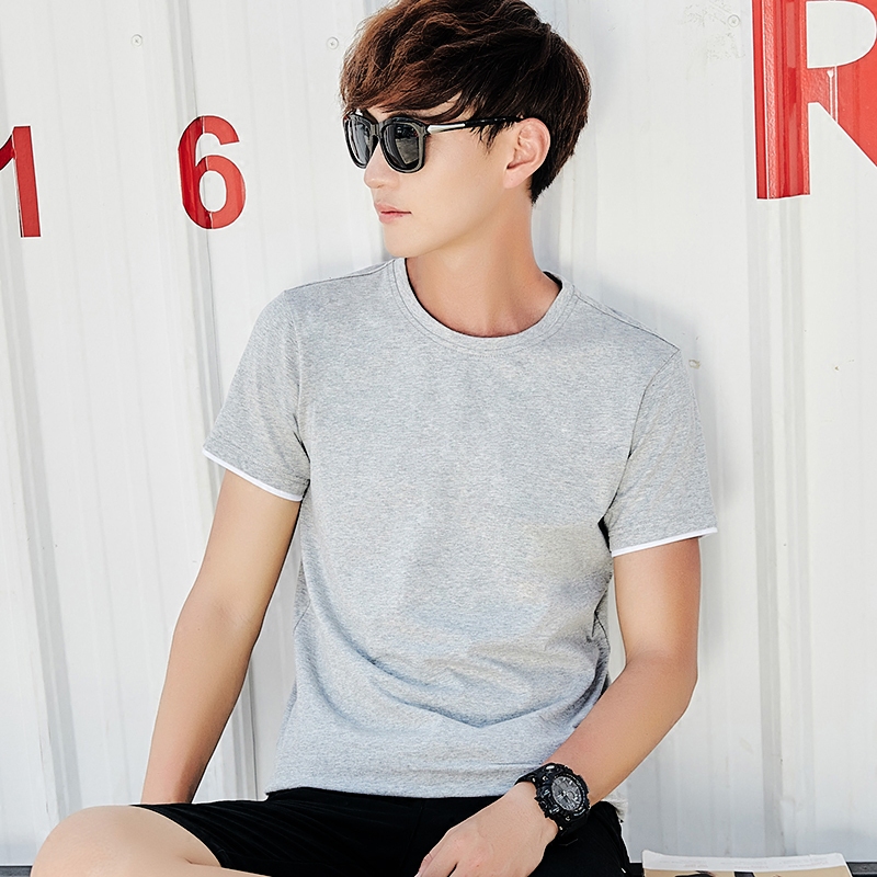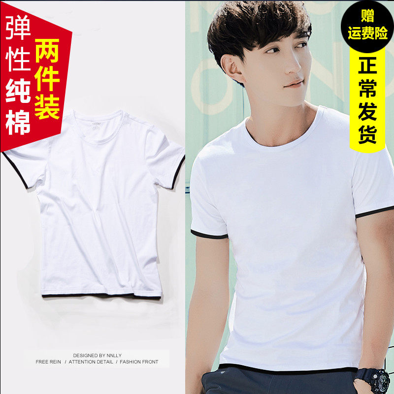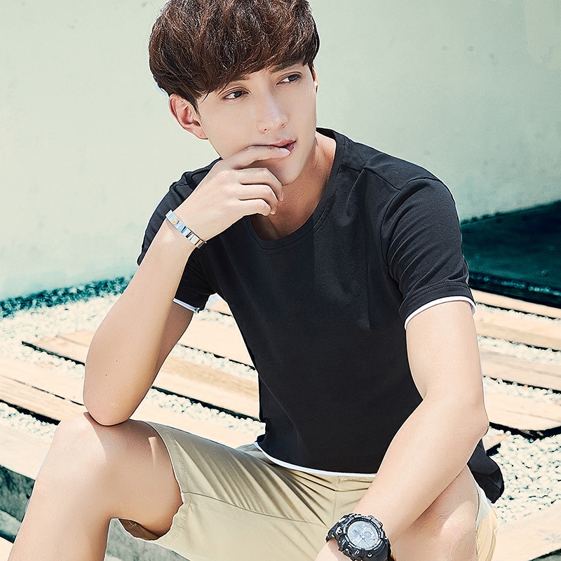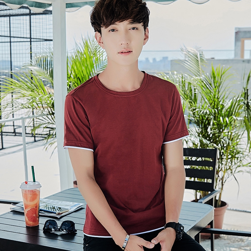 Fake two-piece short-sleeved T-shirt men's solid color T-shirt base shirt Slim-fit crew neck long-sleeved blood tide men's summer top clothes