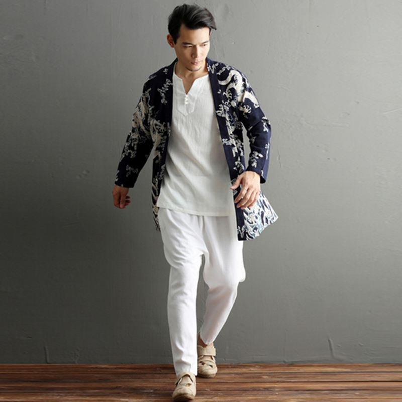 Chinese style dragon robe and cardiovert sweatshirt male Chinese wind cotton hemp large size blouse coat male style medium long version sunscreen jacket tide