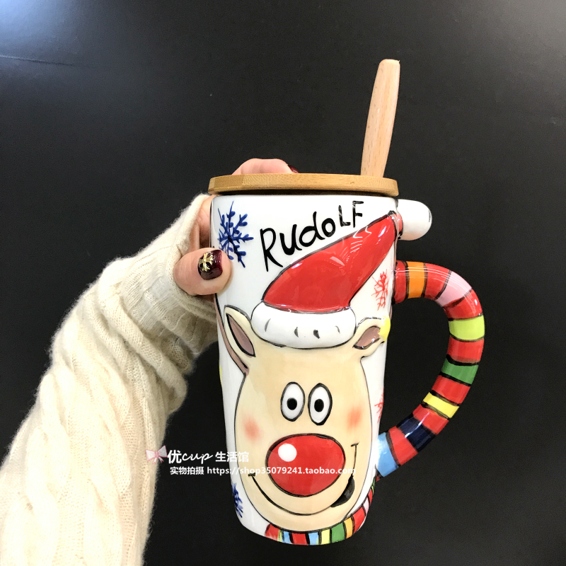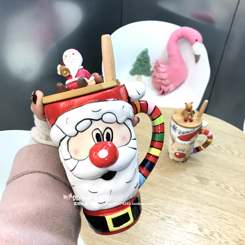 Foreign trade Christmas old man's small cup single cup foreign trade Christmas old man small cup tree spoon bear Christmas 3D hand painted large cup of old man single cup send glue cover Christmas 3D hand painted large cup old man wood lid wooden handle spoonful of deer antlers