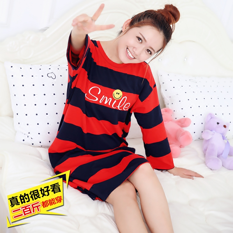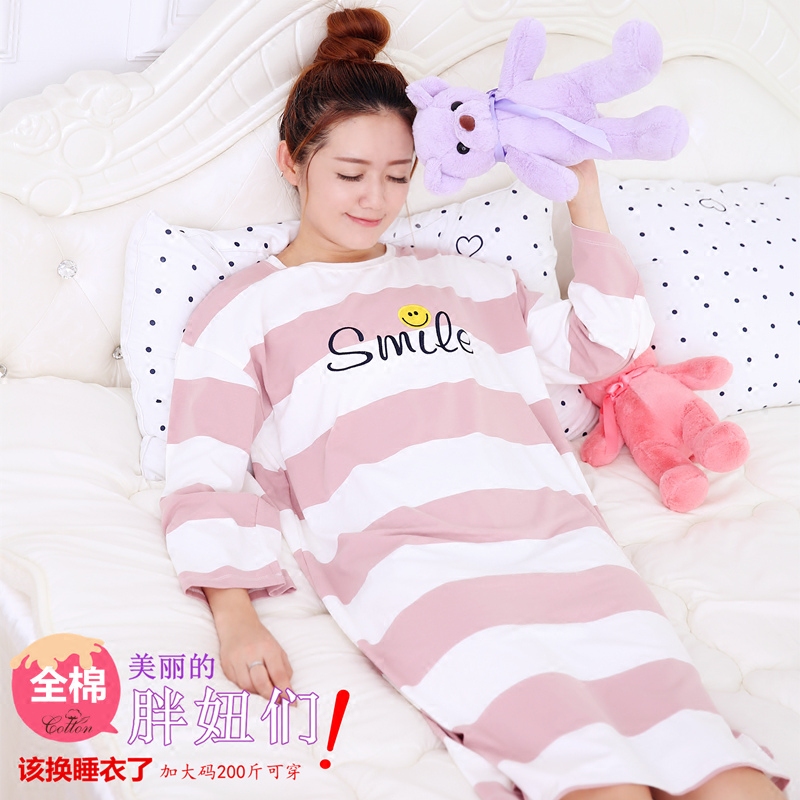 Sleeping dress female spring and autumn pure cotton cute long pajamas stripes loose and weight and large number of fat mm cotton home clothes