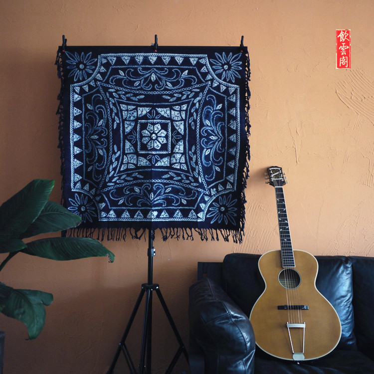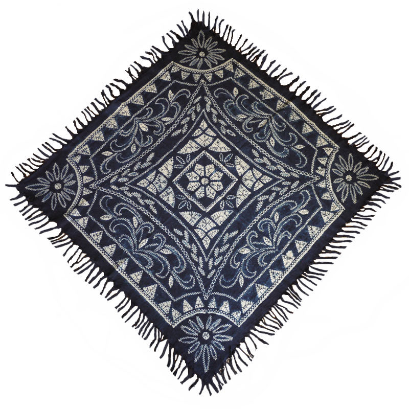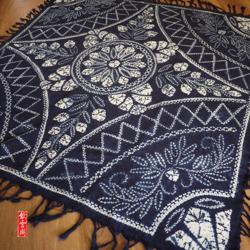 Handmade tie-dyed cloth plant blue dyed pure cotton ethnic old flower tassel tablecloth Yunnan travel gift 110cm square