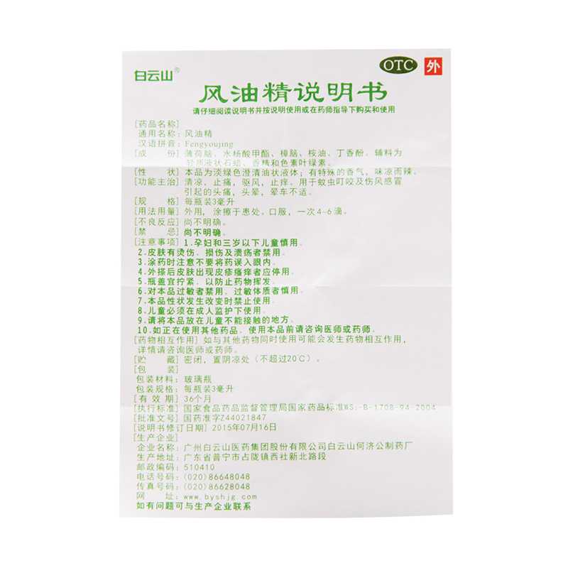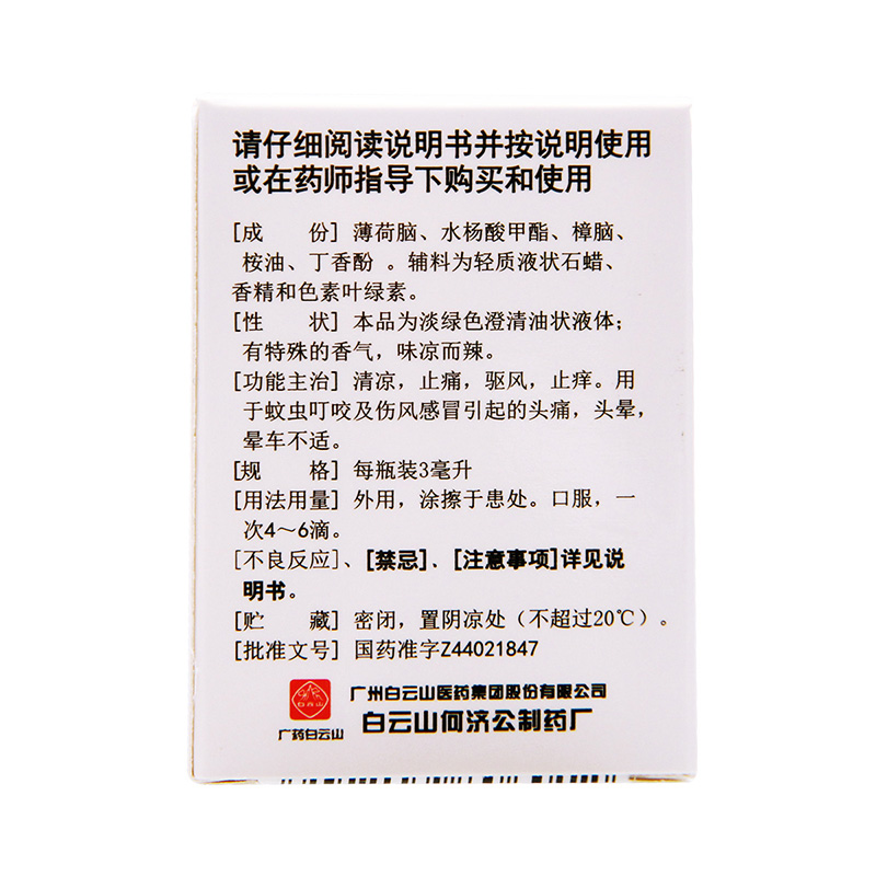 Multiple boxes of discounts) Baiyunshan wind oil essence 3ml carminative refreshing refreshing brain itching headache large bottle