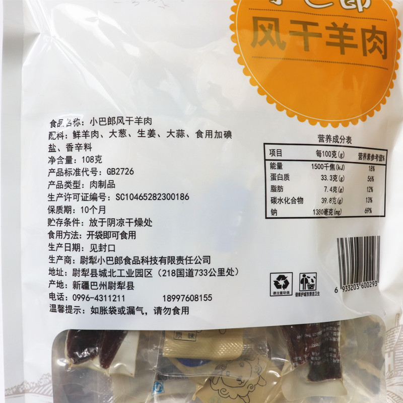 Minibus Lang air-dried lamb Xinjiang specialty Yuli County air-dried lamb dry small package snacks open bag ready-to-eat 108g