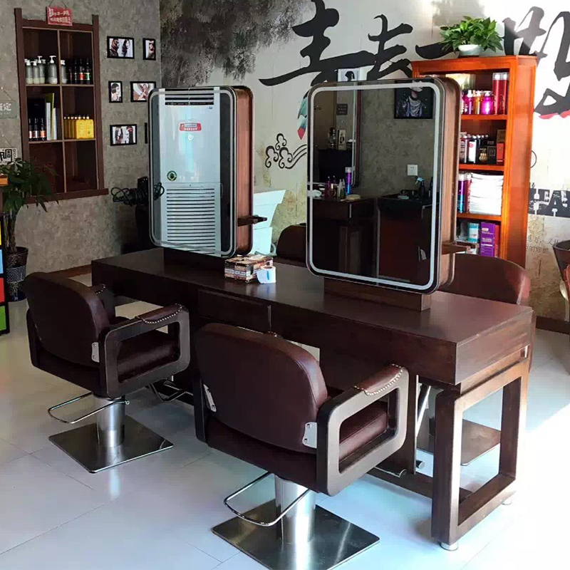 Retro Fashion Rational Shop Mirror Table Beauty Hair Salon Mirror With Lamp Bifacial Solid Wood Table Haircut Mirror Desk Hair Salon Special