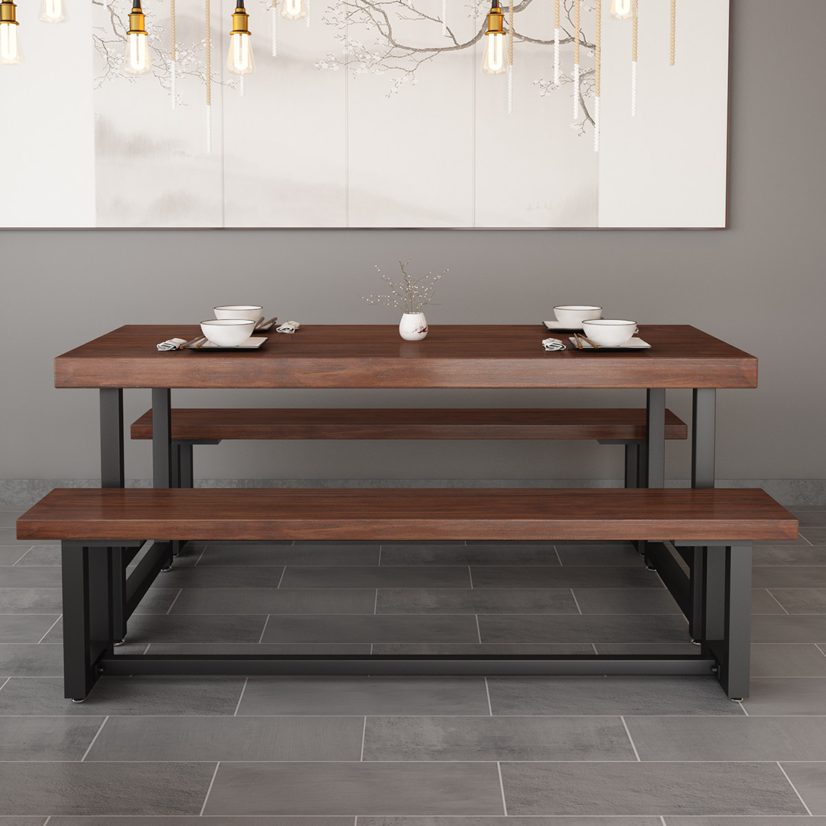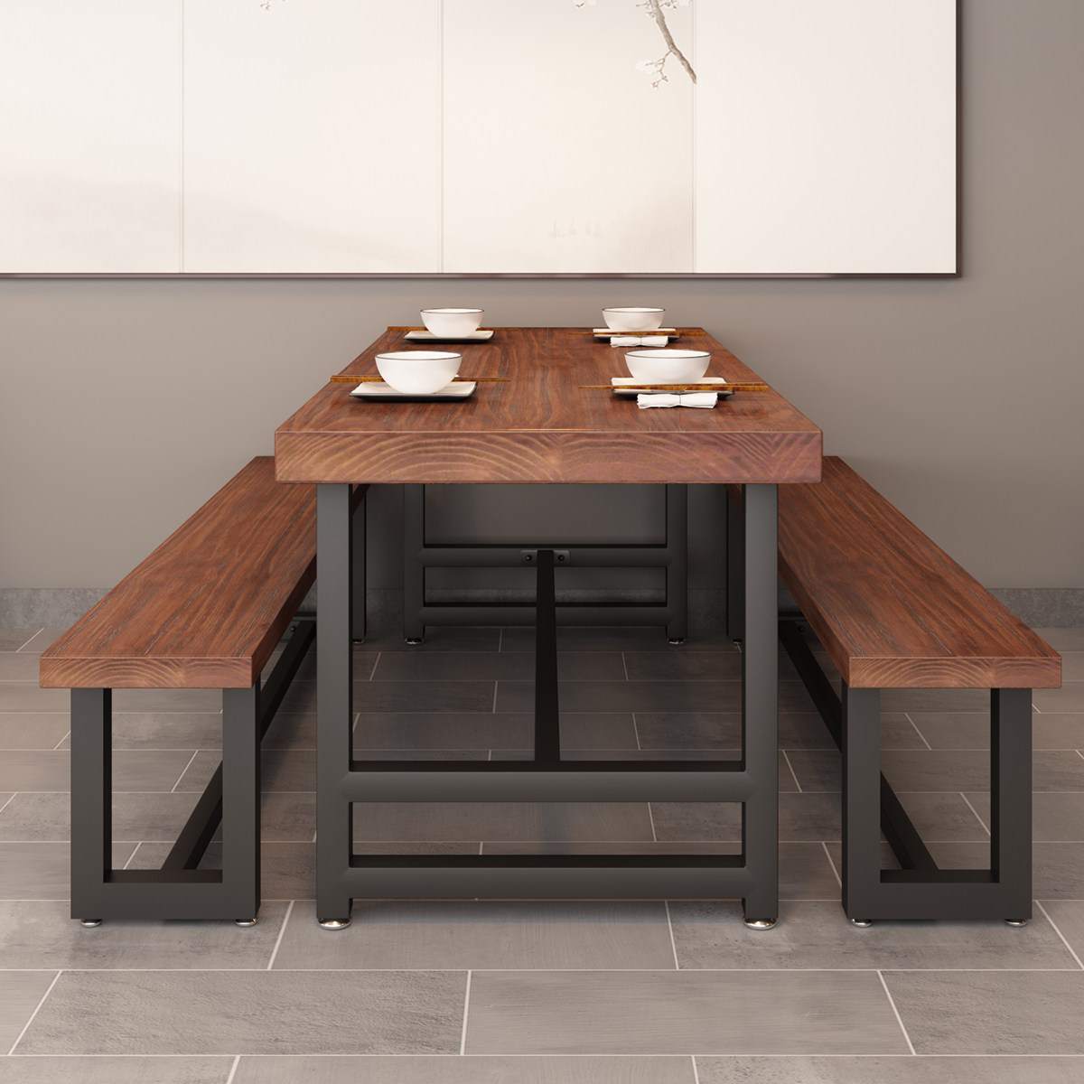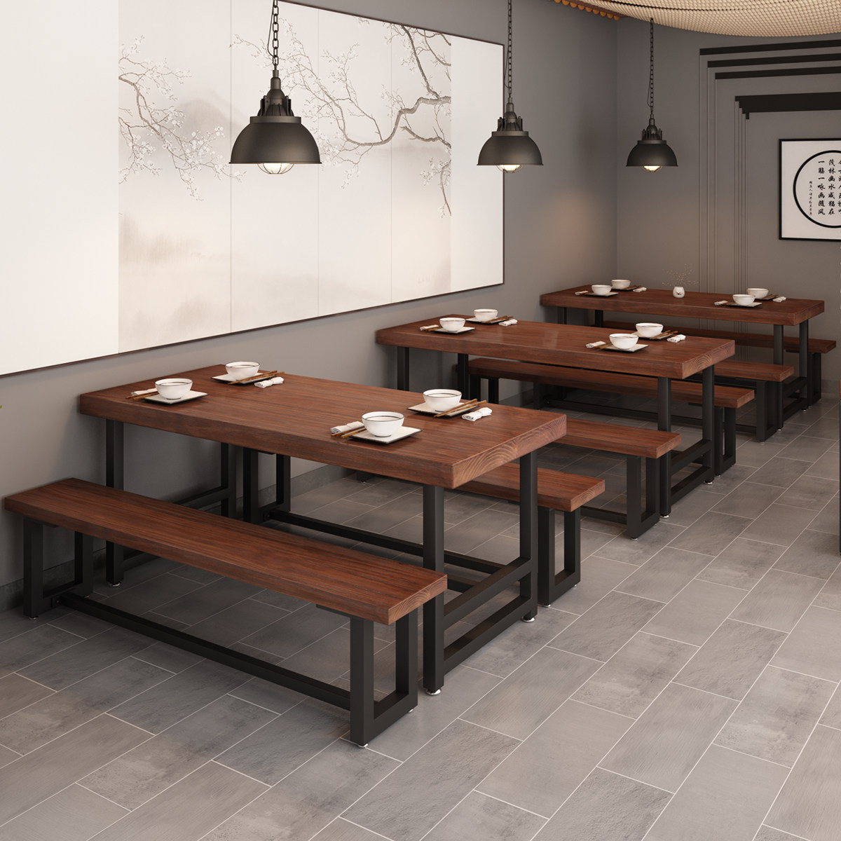 Modern Chinese Wrought iron solid wood dining table Noodle restaurant Vegetarian dining room Dining table and chair combination Household leisure tea table 1058