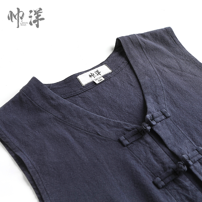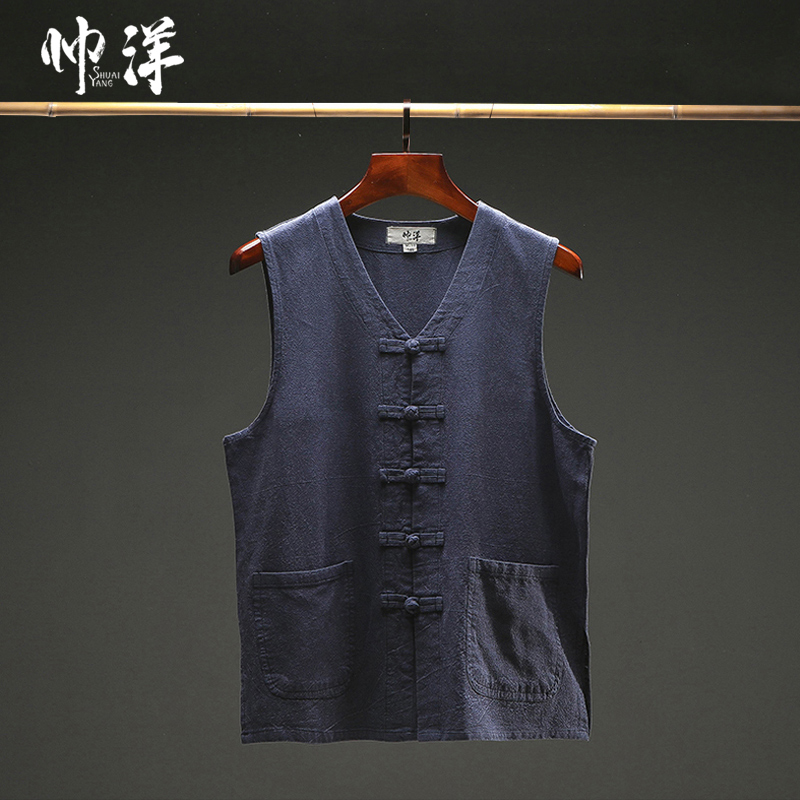 Cotton and hemp new Chinese style men's sleeveless vest vest vintage horse clip Chinese costume plate buckle ethnic style waistcoat