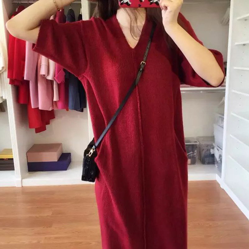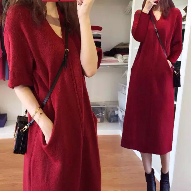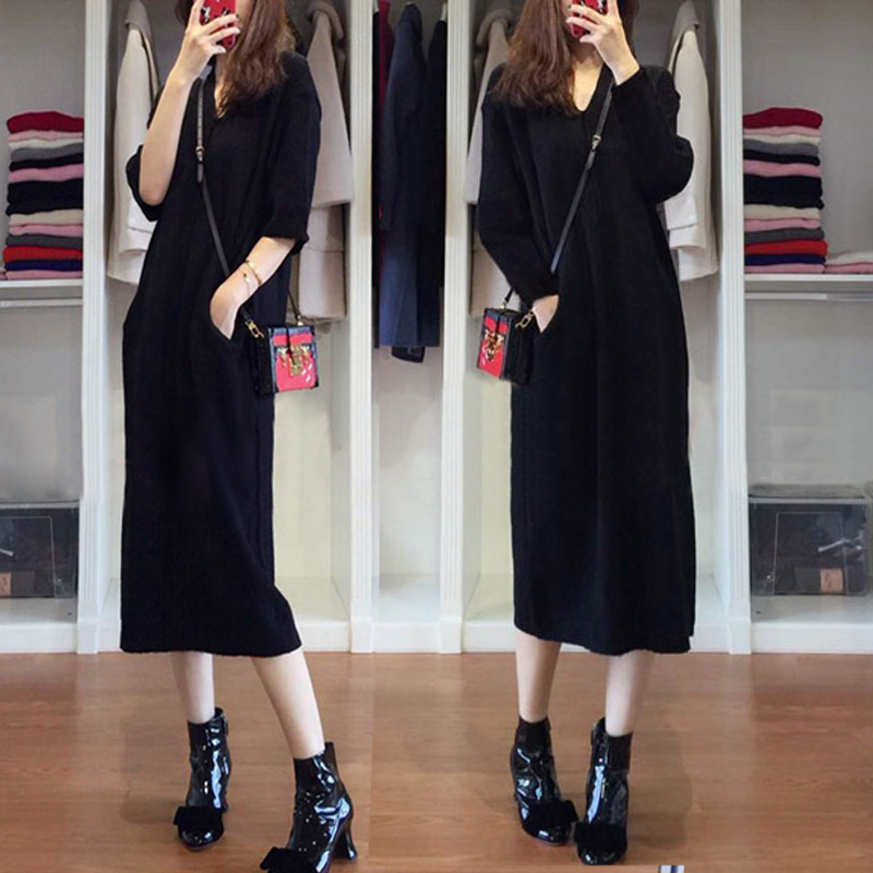 Light-ripened long sleeve knit foreign dress female spring autumn winter long version of sweater dress with knee loose fit inside a long dress