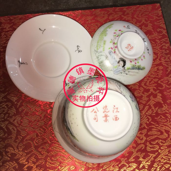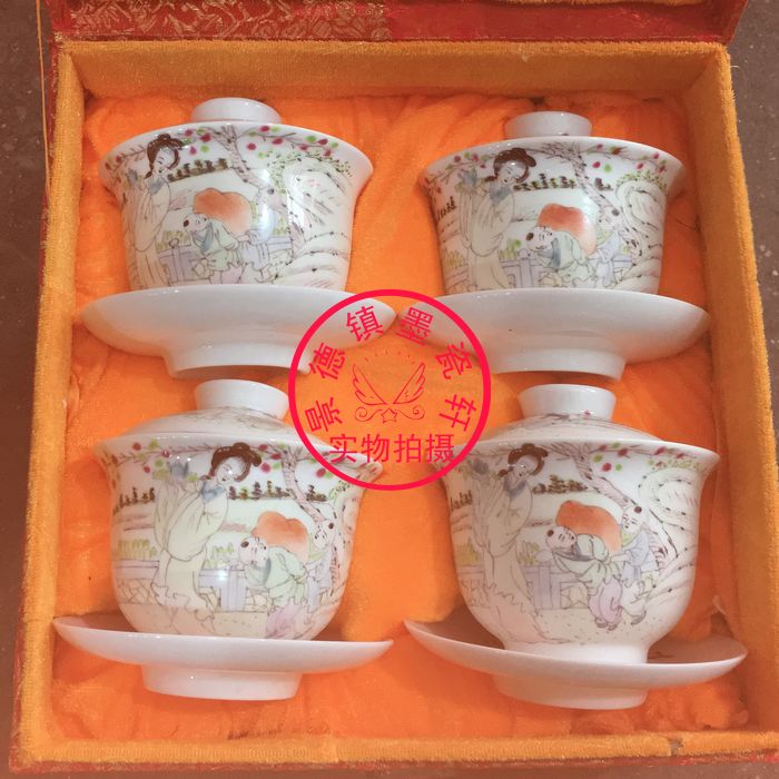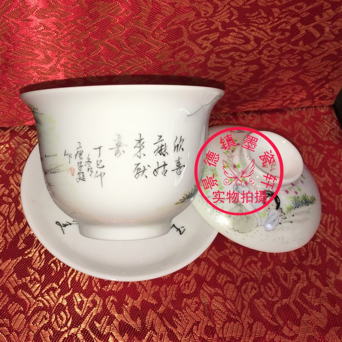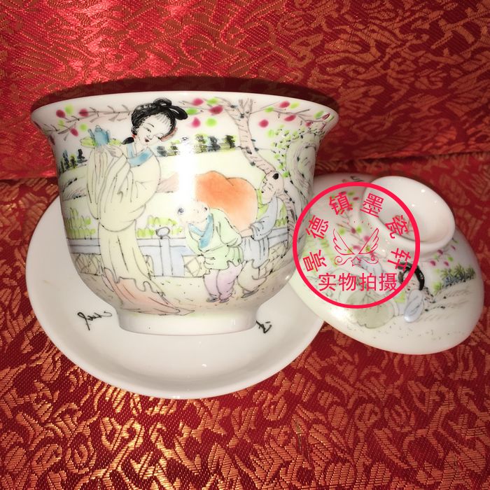Jingdezhen Cultural Revolution Factory goods pottery pastel hand-painted character Ma Gu Xiang Shou San Cai Gaiwan Horseshoe Lidden Cup