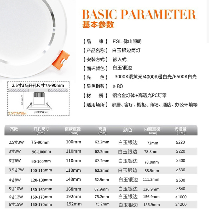 Foshan lighting LED downlight white jade silver edge 2 5 inches 3W drilling 7 5 9 cm embedded guest suspended ceiling hole lamp