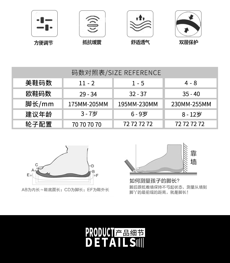 Small size (29-34) 3-7 years old Medium size (32-37) 6-9 years old Large size (35-40) 8 years old - youth