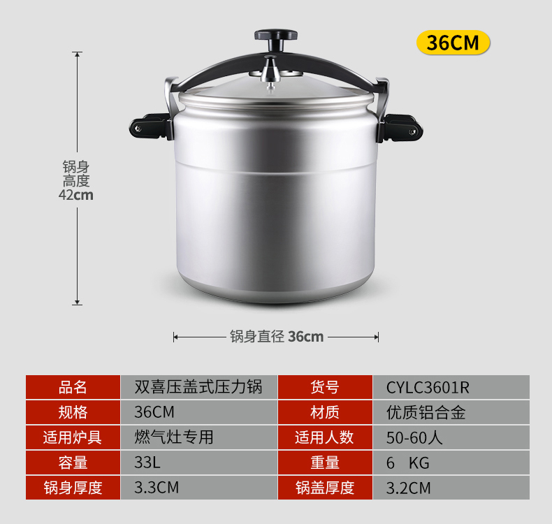 Double happiness pressure cover aluminum pot pressure cooker Gas stove Hotel dining room pressure cooker large capacity commercial 36cm