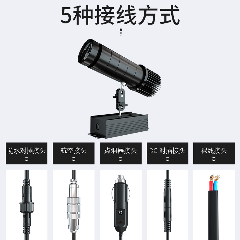There are 5 wiring modes with optional contact customer service 20 W-still section 20 W-rotary section 20 W-waterproof 20 W-rotating section-waterproof 30 W-still-section 30 W-spin