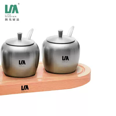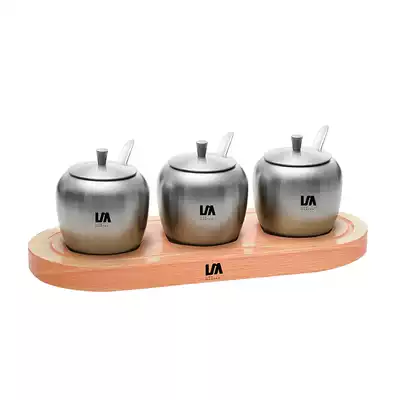 Langma stainless steel seasoning jar 3 pieces set household kitchen utensils salt jar seasoning box covered solid wood base