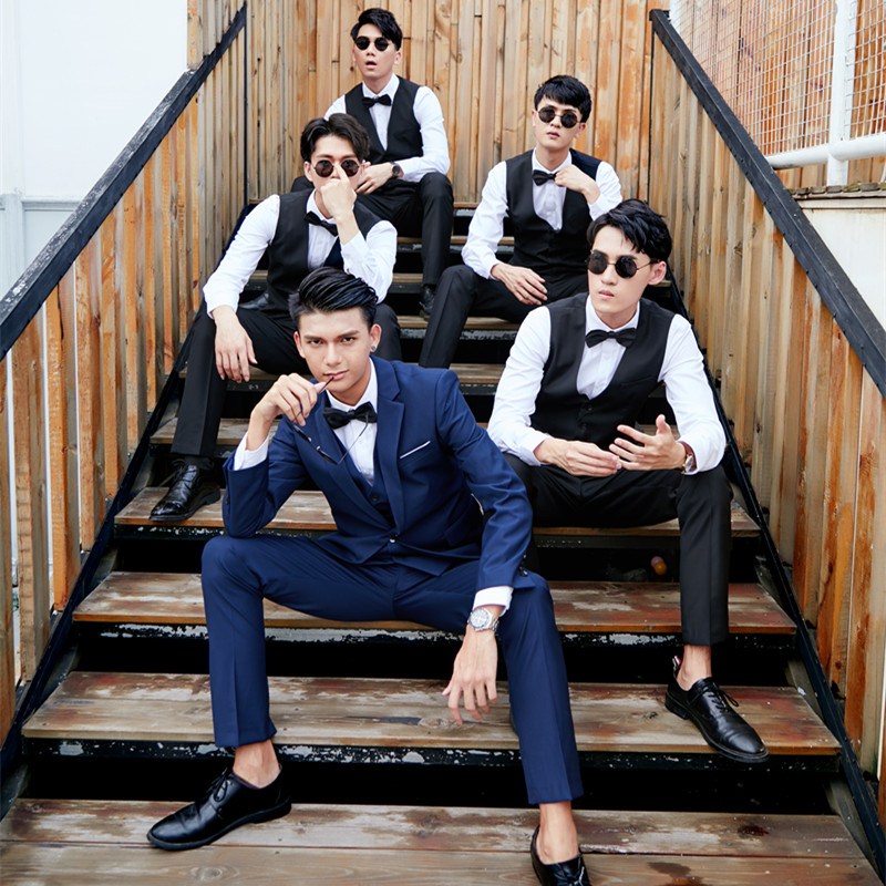 Grey vest long shirt gray trousers red bow tie blue vest long shirt blue trousers black bow tie black vest long shirt black trousers black bow tie short shirt gray vest gray shorts red bow tie