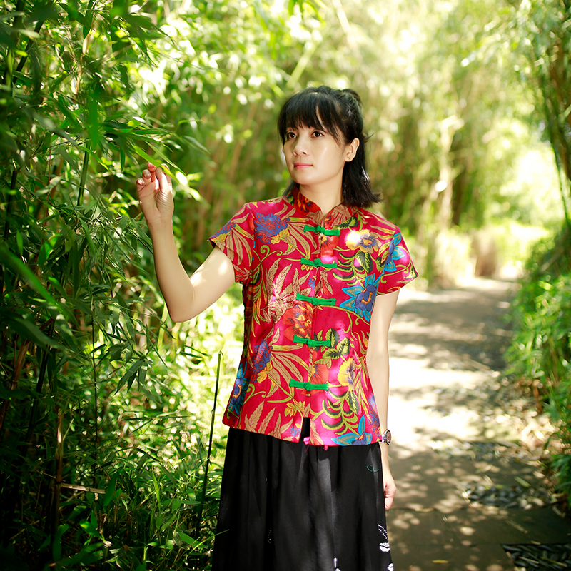 National style women's new round-neck cotton and linen shirt autumn literature and art all-match button short-sleeved thin summer printed top