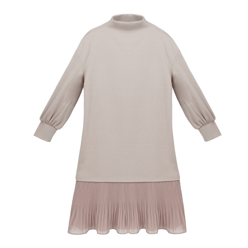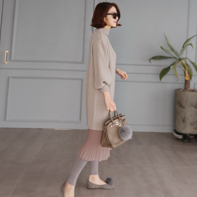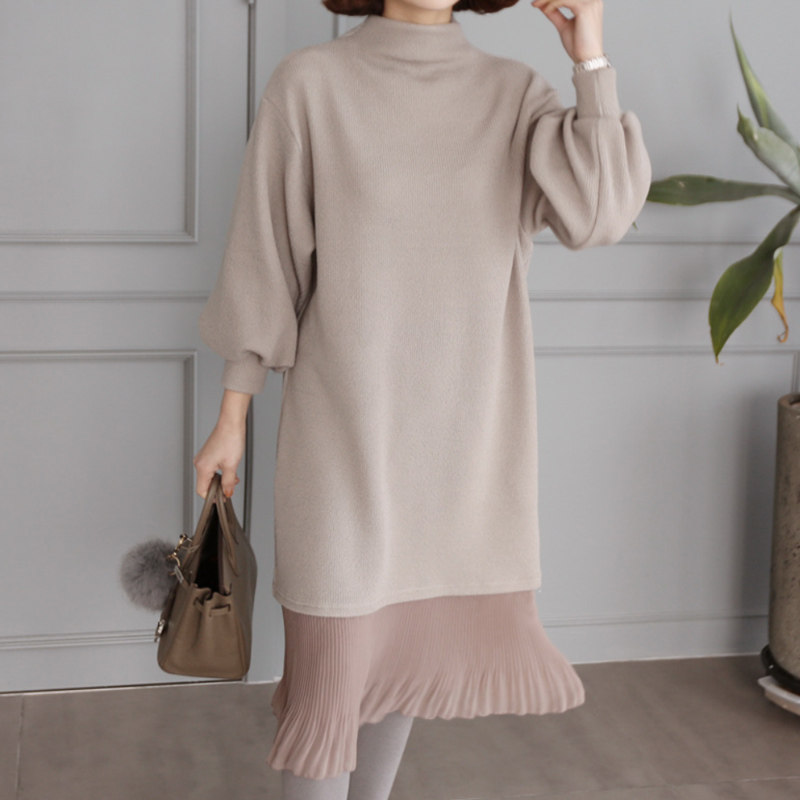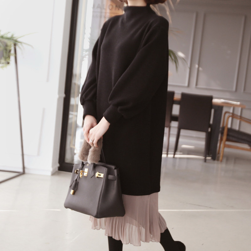 U Home Knit Lantern Sleeves Ocean Dress Woman 2022 Chunqiu New Korean version Half high collar Long version straight drum skirt