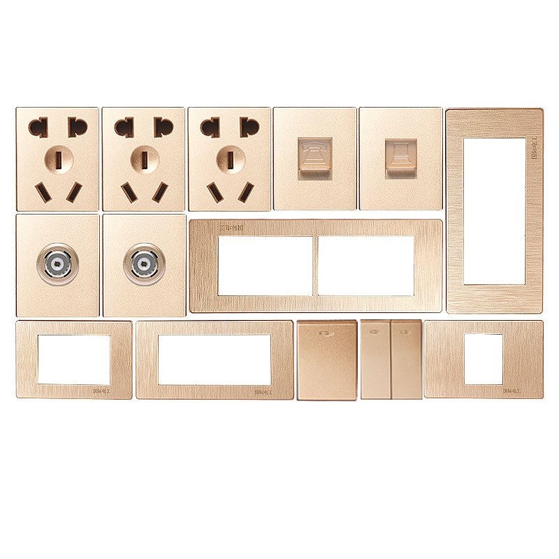 One-bit framework. Two-digit frame. Three-digit frame. Four-bit frame. Five holes (1 bit), one open (1 bit), two open (1 bit), big one open (2 bits), three open (2 bits), 16A (1 bit), TV (1 bit), Telephone (1 bit), Computer (1 bit), Whiteboard (1 bit), Speed regulation (1 bit), Dimming (1 bit), Touch (1 bit), Voice control (1 bit). USB module (1 bit).