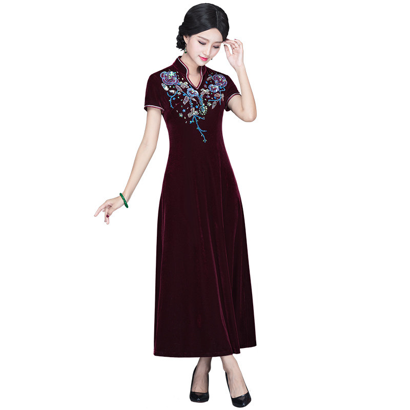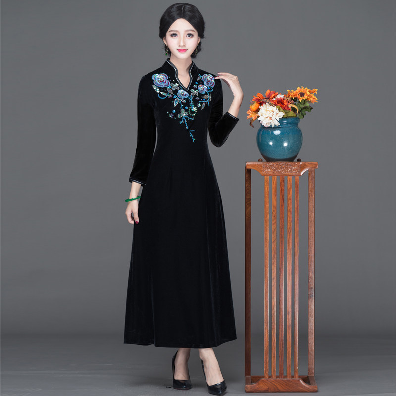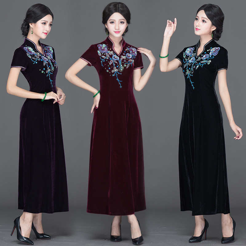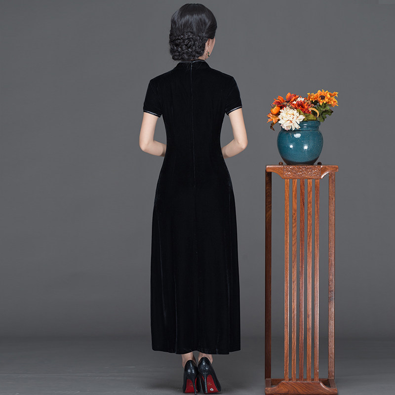 Chinese classic gold velvet cheongsam 2021 new long thin large size socialite mother dress banquet dress skirt autumn