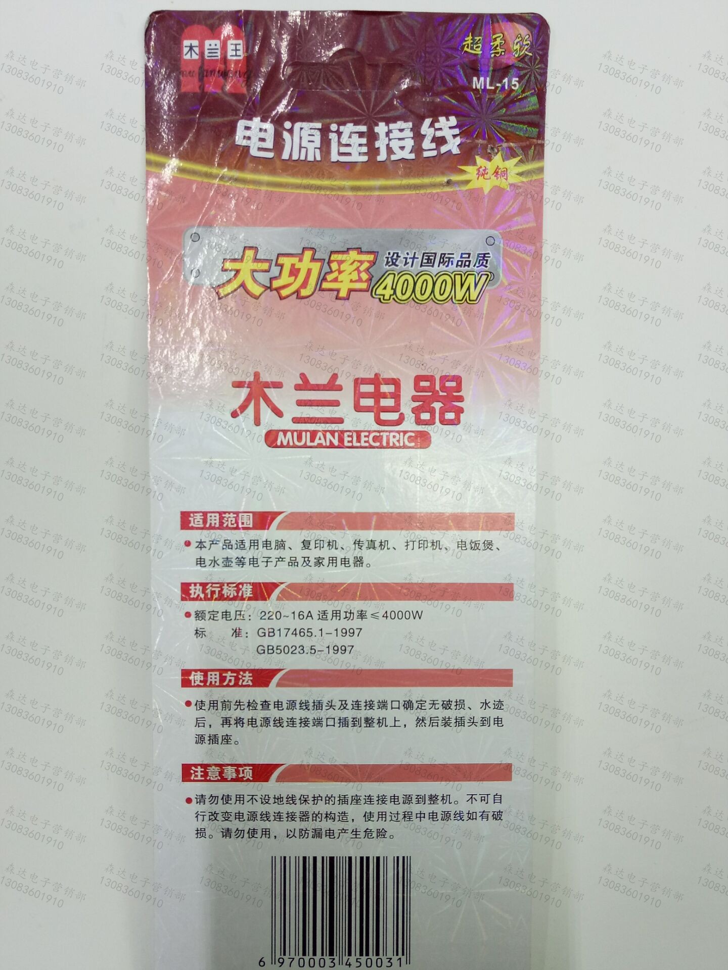 Mulan king high power power cord 3000W pure copper wire 1 square rice cooker computer multi-purpose pot power cord