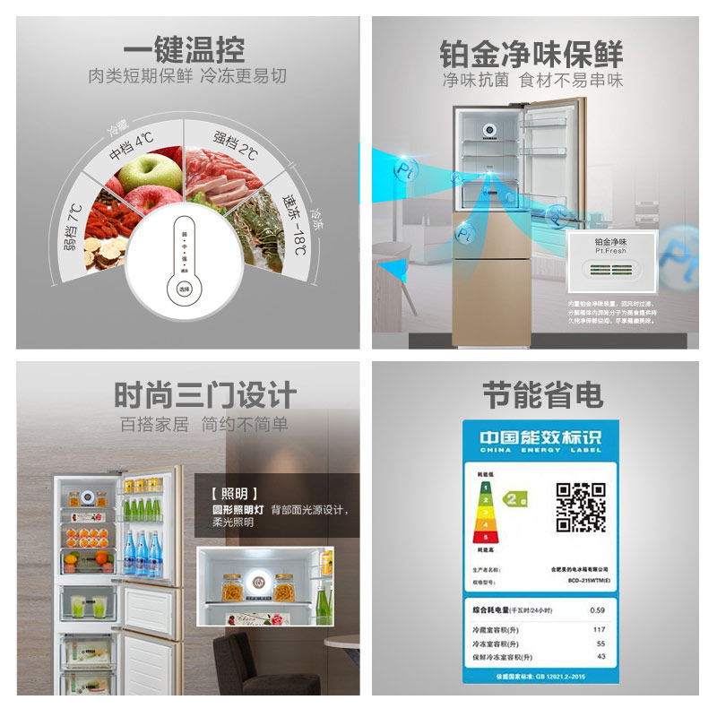 Beauty 215 Liter Air-cooled Frost-free Small Three Doors Home Energy Saving Double Door Quiet Power Saving Refrigerator Double Door