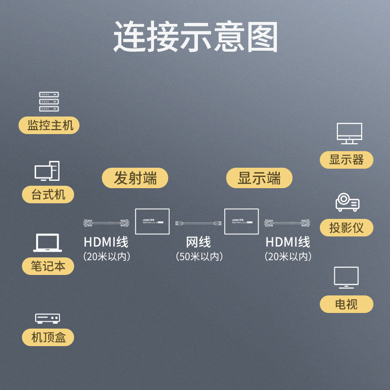 HDMI Extender Turn Single Network Route Network Transmission 50 m 60 m 100 m 100 m HDMI Turns RJ45 Amplifier