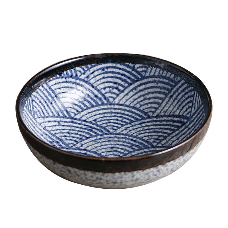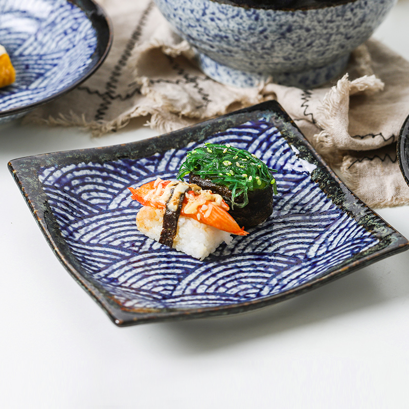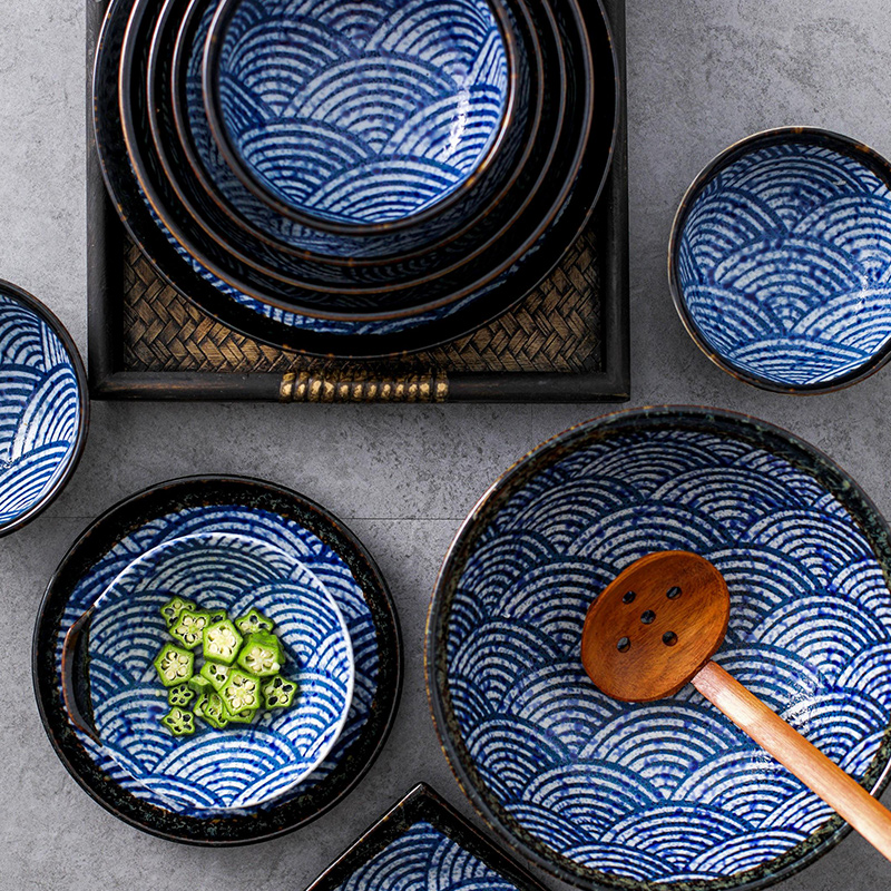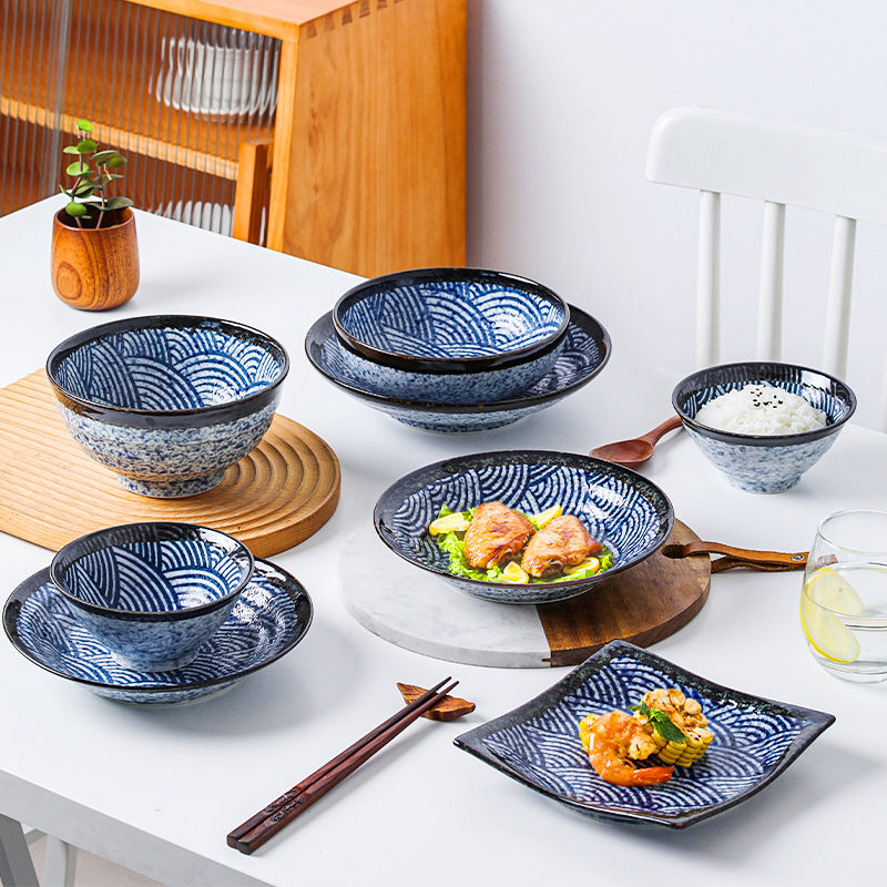 Japan imported ceramic Qinghai wave 8-piece set of bowls and dishes Japanese-style dishes tableware household retro combination rough pottery set