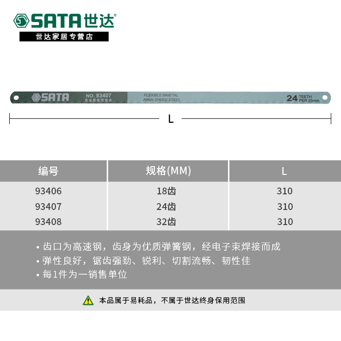 93406 Double metal flexible saw blade (18 teeth) Full length 310 93407 Double metal flexible saw blade (24 teeth) Total length 310 93408 Double metal flexible saw