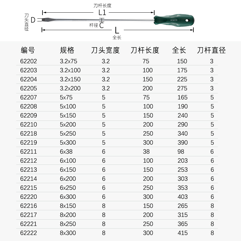 62202 3.2x75mm (full length 150mm) 62203 3.2x100mm (full length 175mm) 62204 3.2x150mm (full length 225mm) 62205 3.2x200mm (total length 275mm) 62207 5x75mm (total length 165mm) 62208 5x100mm (total length 190mm) 62209 5x150mm (total length 240mm) 62210 5x200mm (full length 290mm) 62218 5x250mm (full length 340mm) 62219 5x300mm (full length 390mm) 62211 6x38mm (full length 98mm) 62212 6x100mm (full length 203mm) 62213 6x150mm (full length 253mm) 62214 6x200mm (total length 303mm) 62215 6x250mm (full length 353mm) 62220 6x300mm (full length 403mm) 62216 8x150mm (total length 265mm) 62217 8x200mm (full length 315mm) 62221 8x250mm (total length 365mm) 62222 8x300mm (total length 415mm) 09306 8-piece A-series set 09309 6-piece T-series set