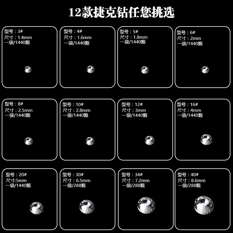 White Diamond SS3# (1.4mm) 1440 White Diamond SS4# (1.6mm) 1440 White Diamond SS6# (2mm) 1440 White Diamond SS8# (2.5mm) 1440 White Diamond SS10# (2.8mm) 1440 White Diamond SS12# (3mm) 1440 White Diamond SS16# (4mm) 1440