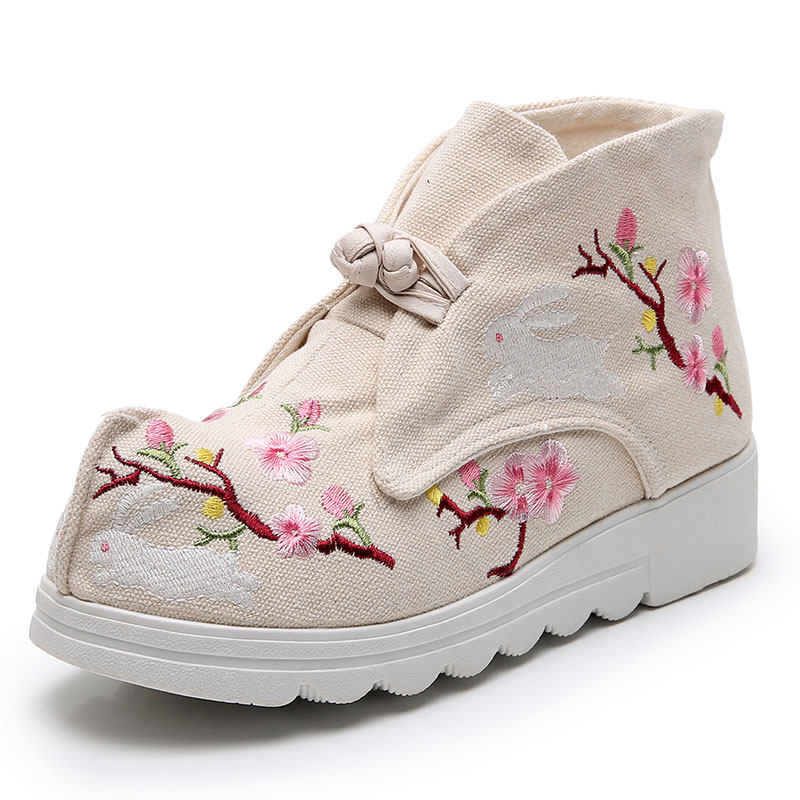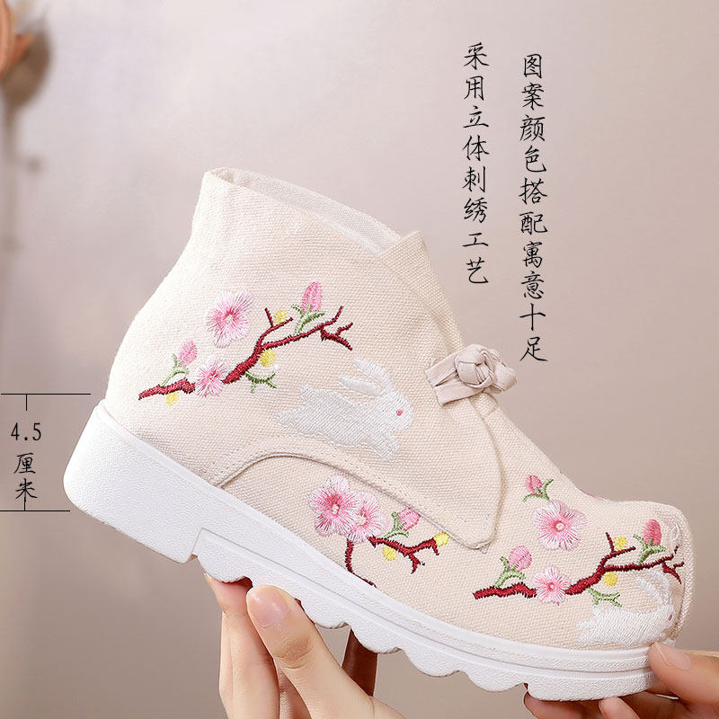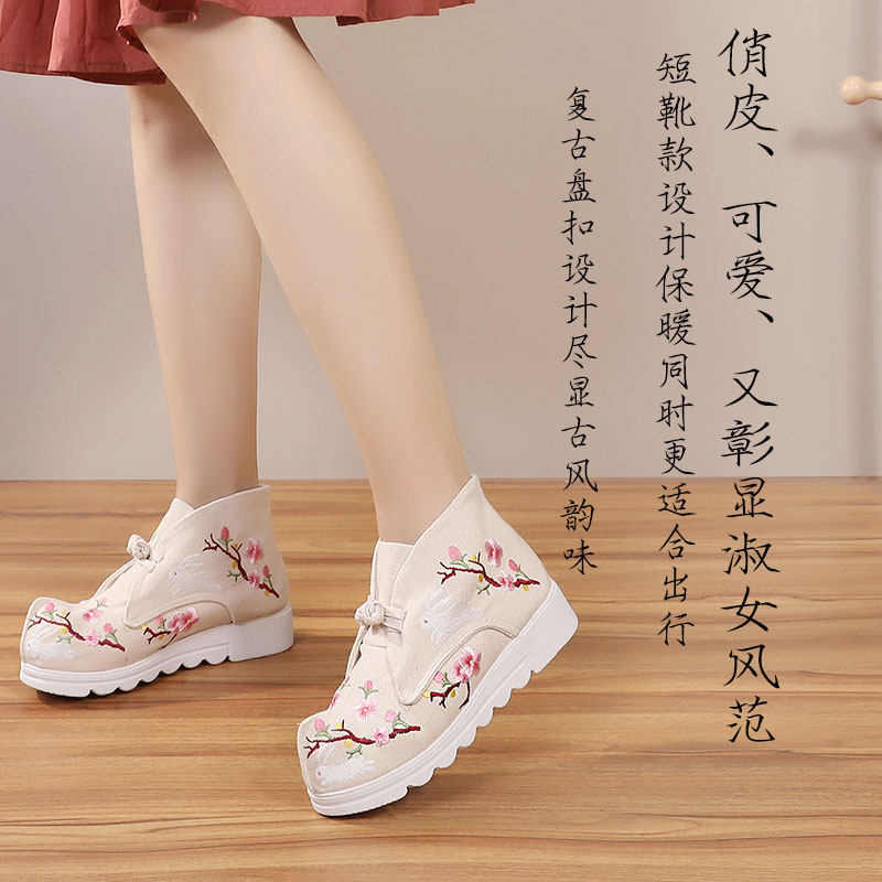 Hanfu shoes women's velvet thick-soled boots flat-bottomed tea artist cotton shoes ancient costume upturned head shoes ethnic ancient style embroidered shoes