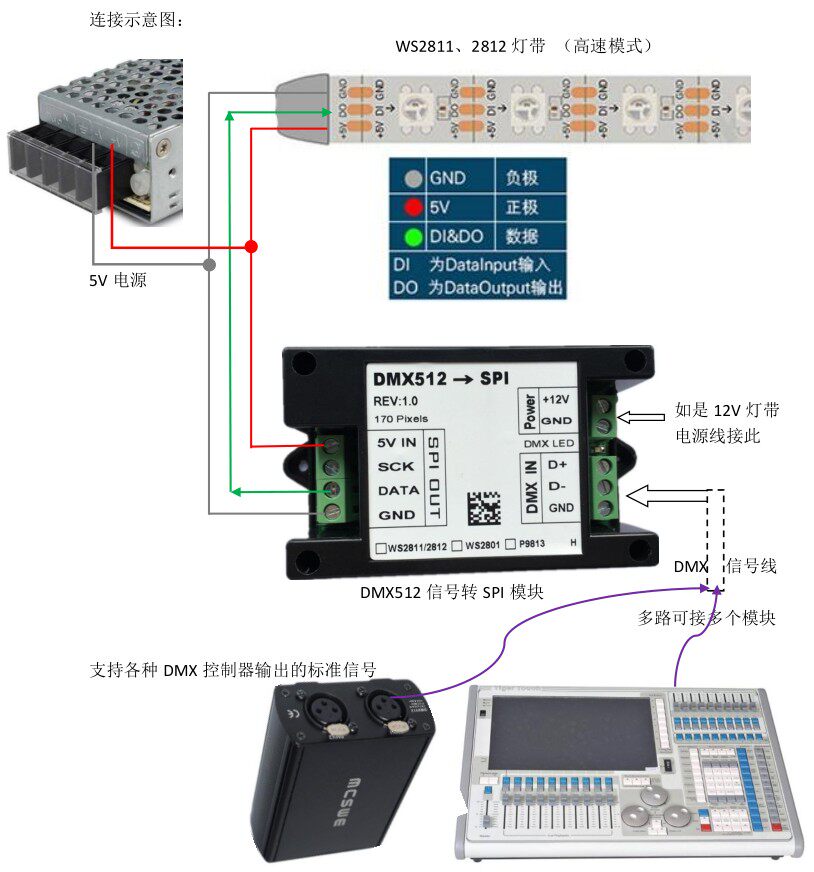 DMX512 turn SPI signal lamp with lamp string decoding control WS2811 12 2801 can set address code 1903
