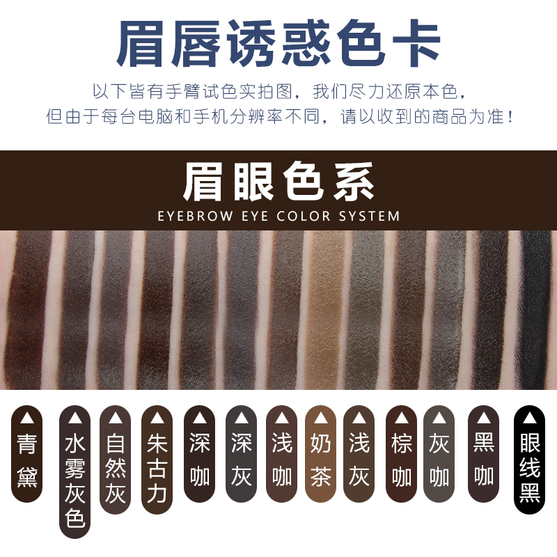 Army Green Dark Green Emerald Green Fluorescent Green Light Green Peacock Blue Royal Blue Royal Blue Blue Light Blue Blue Sky Blue Light Purple Blue Sky Blue Light Purple Eyebrow Lip Temptation-Eyeliner Black Eyebrow Lip Temptation-Black Coffee Eyebrow Lip