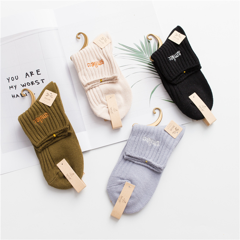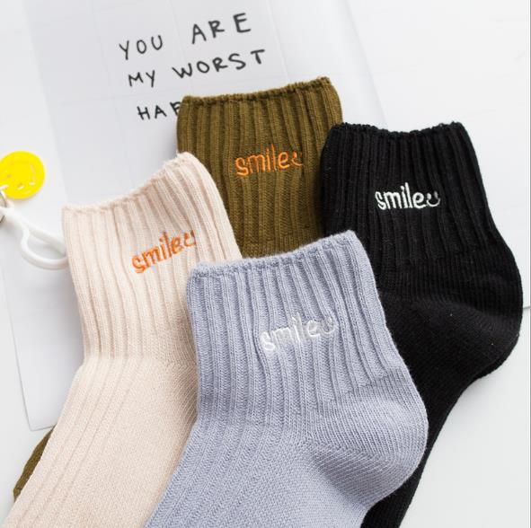 Autumn Winter Day Department Women Socks Pure Cotton Double Needle Thick Thread Lady Midbarrel Socks SMILE Smiley Face Smile Embroidered Foam Socks