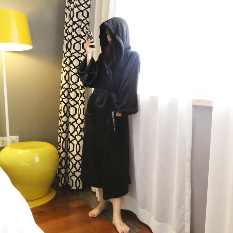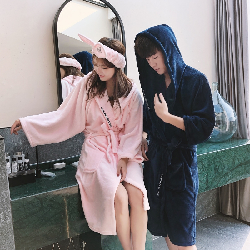 COOL flannel hooded nightgown Women's winter bathrobe Couple pajamas Men's bathrobe thickened extended coral velvet home clothes