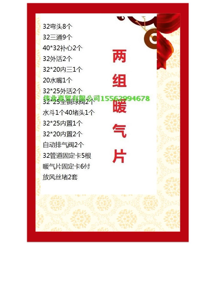 32 steel plastic PPR tube per root 4 m 1 stove 1 heating sheet mounting accessories 1 stove 2 heating sheets mounting accessories 1 stove 3 heating sheet mounting accessories 1 stove 4 heating pieces