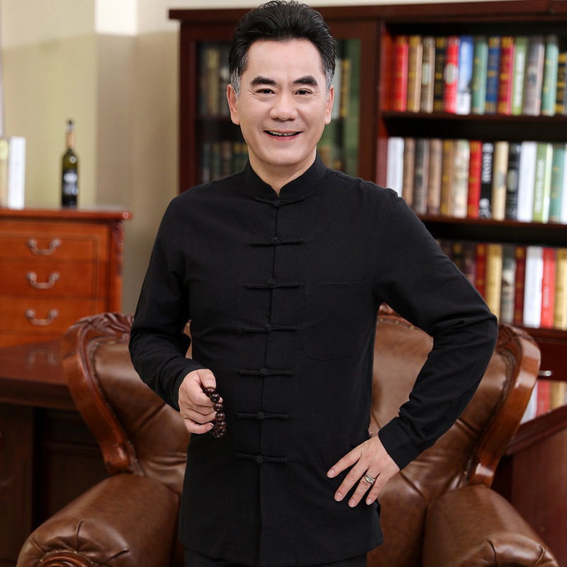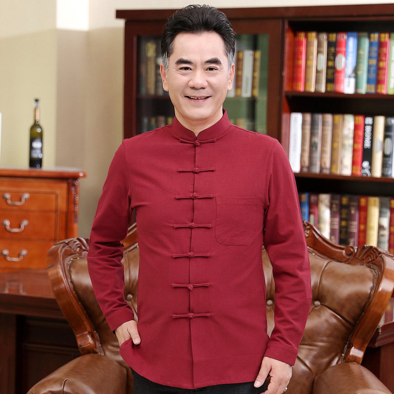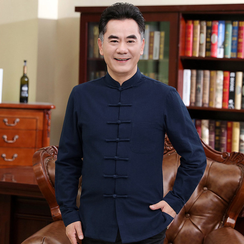 Middle Aged Tang Dress Men's Long Sleeves Spring Autumn Chinese Pure Cotton Shirt Seniors China Wind Lining Clothes Stand Collar Pan Button Blouses-Taobao